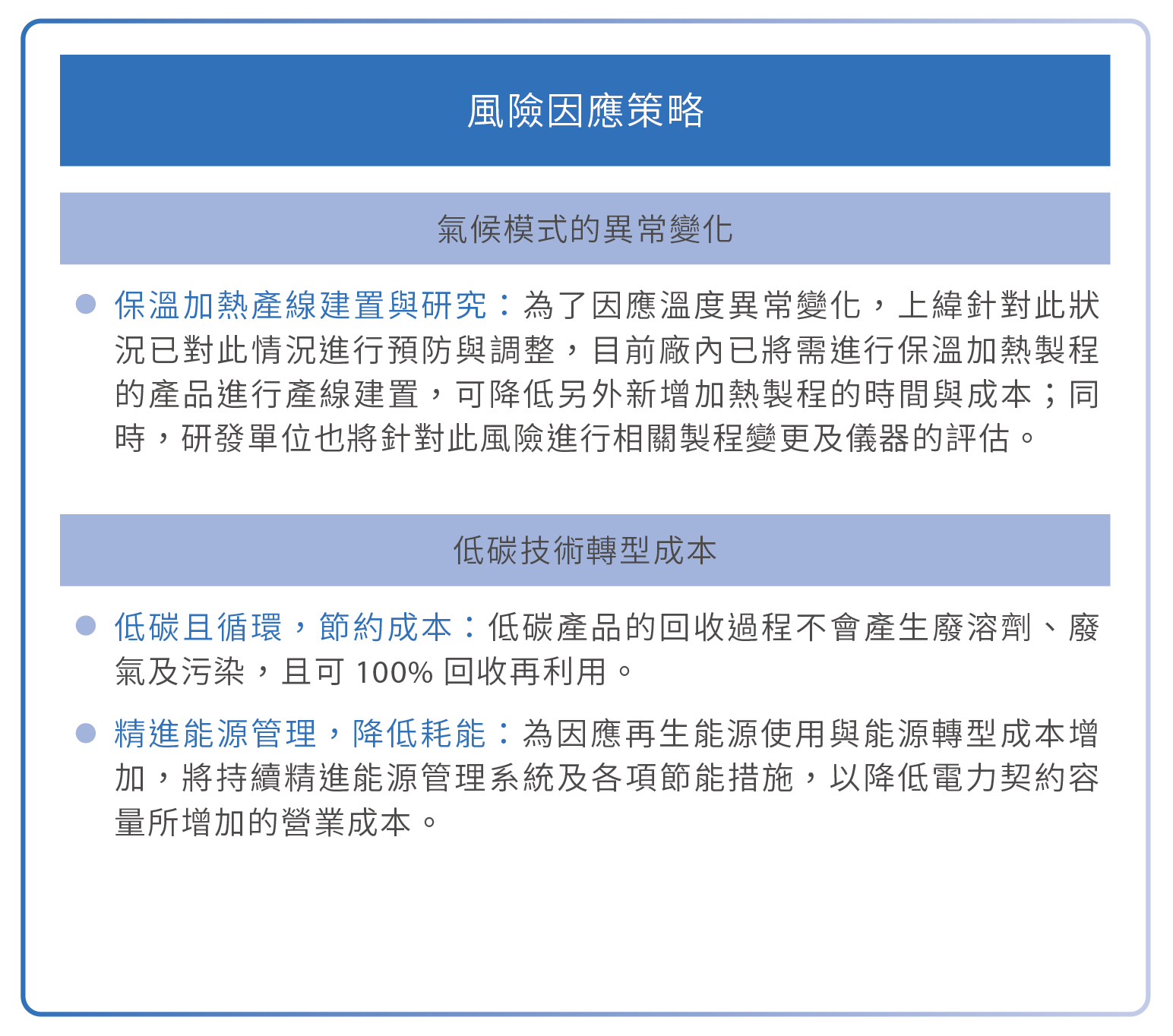 | 風險項目 | 風險說明 | 因應對策 |