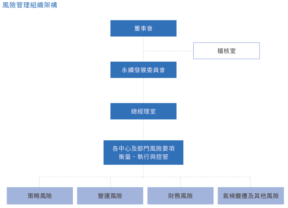 董事會負責核定風險政策及執行結果;永續發展委員會負責審核風險管理範圍及規範,並負責督導相關運作落實情形;總經理室負責擬定風險管理規範,並且每年至少向董事會報告1次相關作業落實情形,以確保董事會及永續發展委員會了解與核可風險管理規範之執行;各中心及部門主管負責設定風險管理作業要點,進行風險衡量監控與執行,依內部控制程序,合規及執行風險規範。