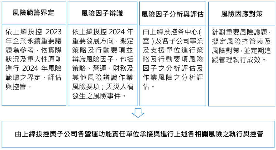 上緯投控於2018年訂定「風險管理辦法」,並經董事會通過,子公司於內控制度亦訂有類似規範以作為風險控管之依據。上緯投控及子公司之風險管理辦法,包括風險管理政策與程序,風險管理範疇、風險組織架構及風險管理與監控。