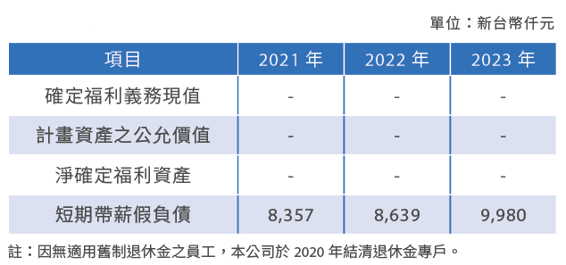 合併公司之確定提撥計(jì)畫係依勞工退休金條例之規(guī)定,依勞工每月工資6%之提繳率,提撥至勞工保險(xiǎn)局之勞工退休金個(gè)人專戶。在此計(jì)畫下合併公司提撥固定金額至勞工保險(xiǎn)局後,即無支付額外金額之法定或推定義務(wù)。 合併公司2023年、2022年及2021年確定提撥退休辦法下之退休金費(fèi)用分別為40,059千元、40,099千元及36,906千元。