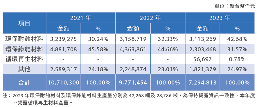 註:2022年環(huán)保耐蝕材料及環(huán)保綠能材料生產(chǎn)量分別為32,490噸及36,385噸。