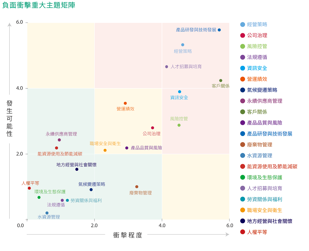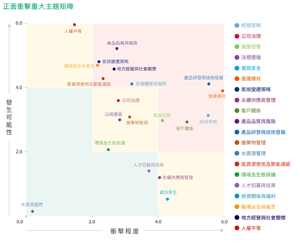 同時,上緯內部高階長官依據各永續議題在上緯營運時對治理/經濟、環境、社會的衝擊程度進行評估、填寫問卷,共發出7份問卷、回收率100%,有效問卷數為7份,經統計與分析得到衝擊程度排序。