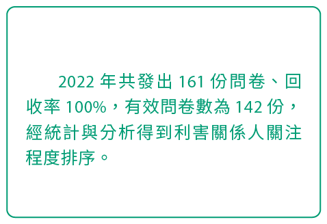 上緯參考GRI 準則之主題、產業重要議題以及2023年度之重要發展後,因2023年相關產業及關注議題與2022年無太大差異,所以延續上一年度分析結果,篩選出20個永續議題。 為了解各類重大利害關係人之意見,由各權責單位分別對外發放關注議題問卷;