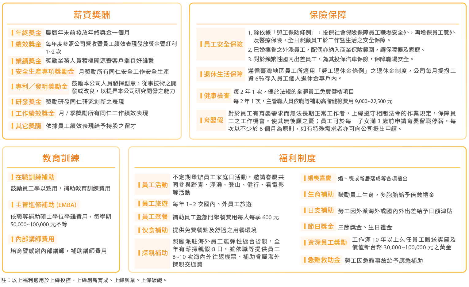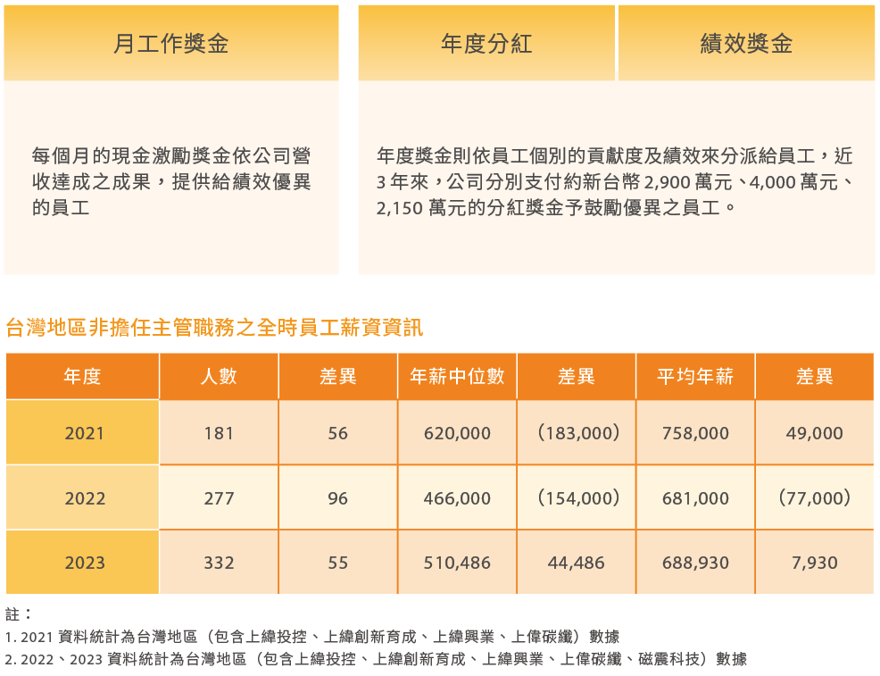 上緯本於照顧全體員工為宗旨,以完善的薪酬制度、福利措施及績效管理制度,秉持與員工利潤共享的理念,以吸引、培育、留任人才。員工薪酬