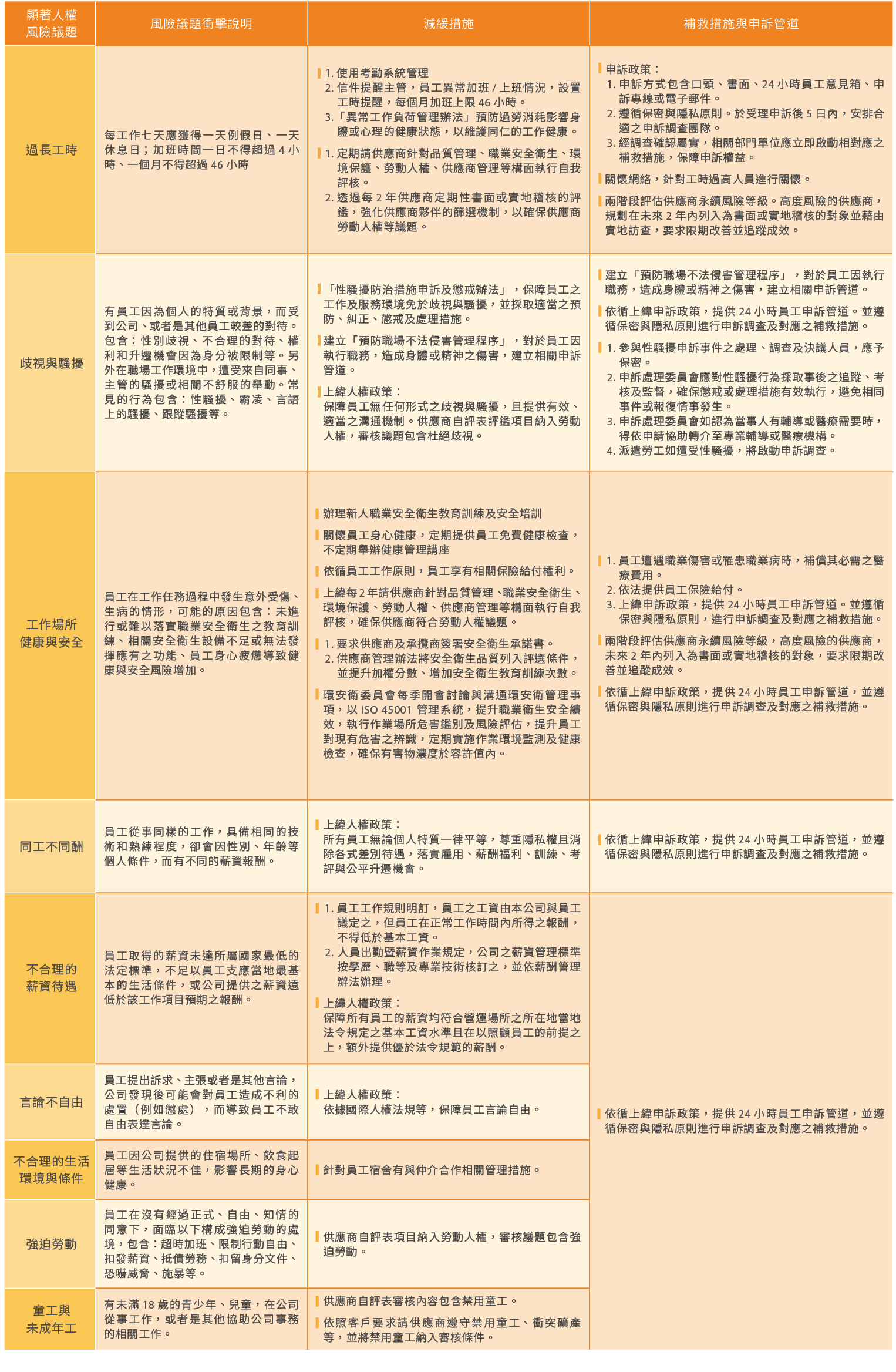 上緯依照人權風險評估流程所評估出之顯著人權議題,彙整各子公司針對各項議題建立的衝擊評估機制、風險減緩與補救措施。以下內容適用於上緯的國內營運據點,並全面落實相關措施。