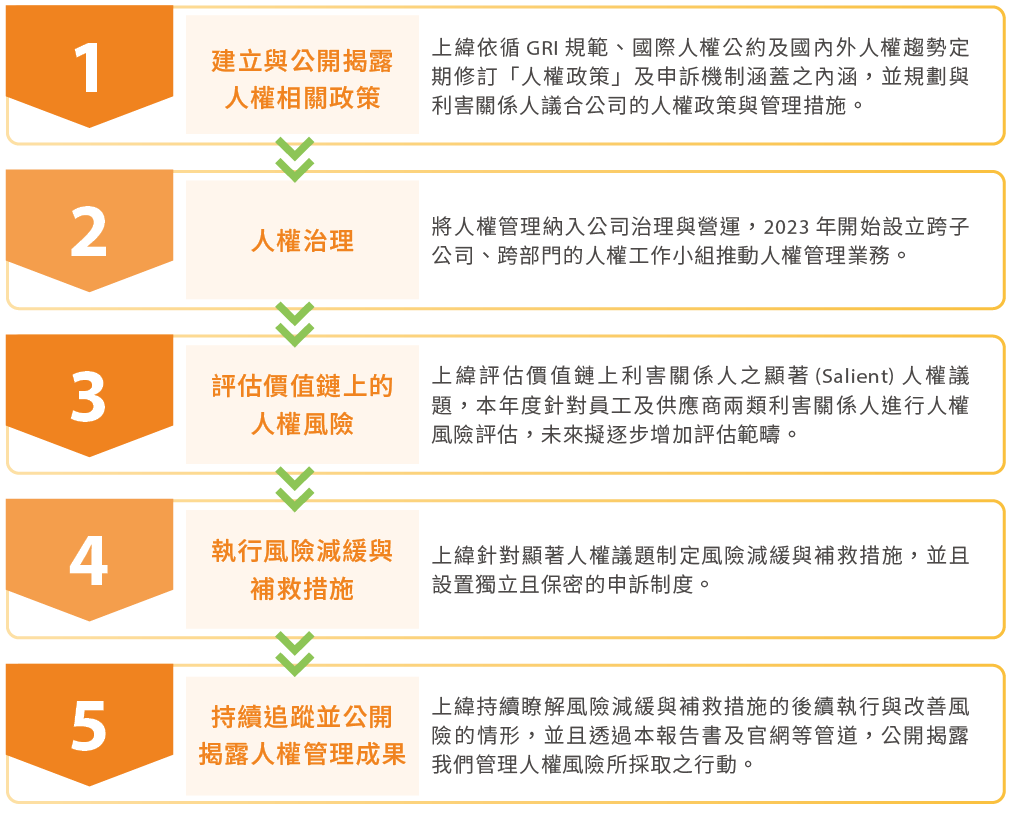 上緯積極落實人權管理作為,我們制定並公告適用於整體營運價值鏈之人權政策,並以人權小組為主責推動政策落實的單位,定期執行人權風險評估,規律檢視公司營運價值鏈可能產生之人權影響,並辦理人權教育訓練,向員工、供應商及其他利害關係人溝通公司的人權政策和相關規範,確保所有利害關係人熟悉公司人權政策和規範,共同守護產業的人權價值。