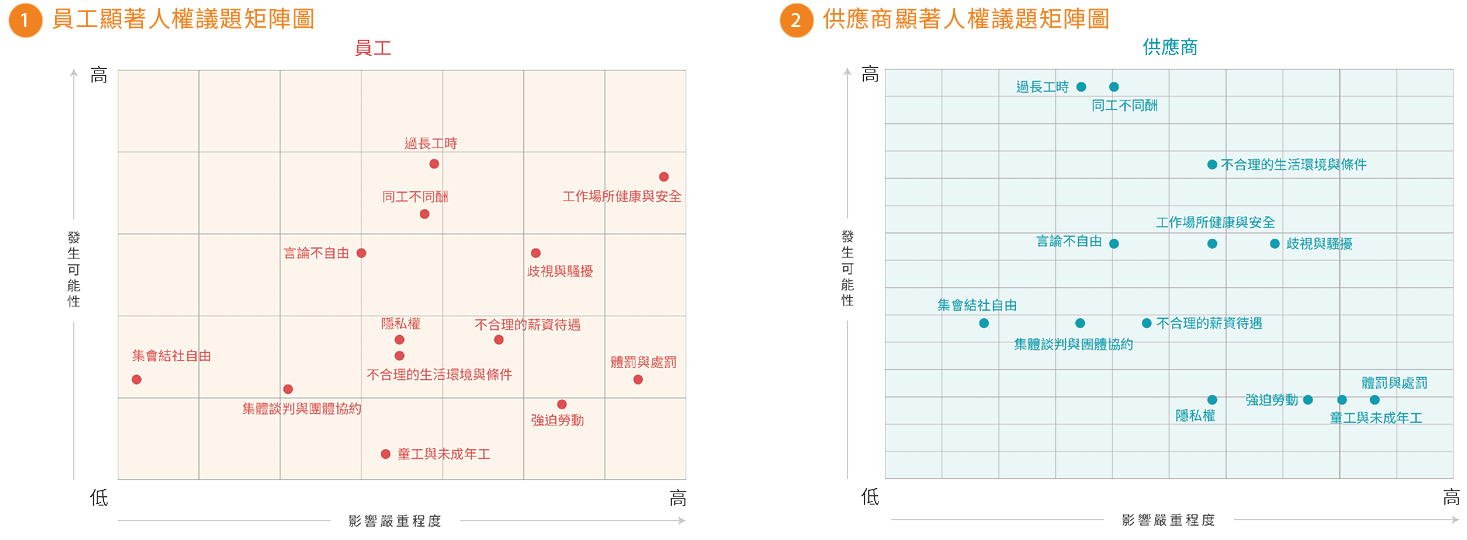 人權風險評估結果-顯著人權議題清單 員工顯著人權議題共有7項;供應商之顯著人權議題共有8項。