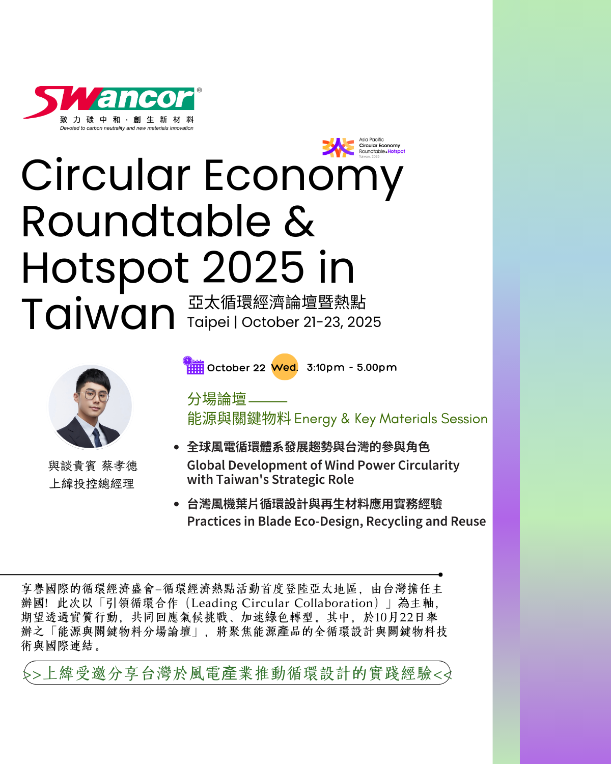 上緯投控很榮幸能參與此盛會,蔡孝德總經理將於「能源與關鍵物料」主題場次與各界專家共同探討循環(huán)經濟的未來發(fā)展。